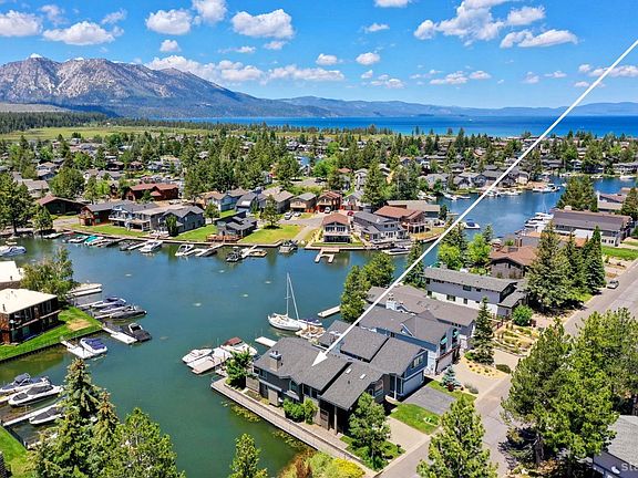 Check out the new price!! Beautifully re-styled with the utmost in thought, elegance and quality describe this Tahoe Keys home befitting this one of a kind waterfront location within South Lake Tahoe.The spectacular wide water and mountain views are framed the moment you walk up the entry stairs to the living/great room. The interior textures compliment what nature offers whether it be day or evening, and any of the 4 seasons.3/4 in hickory floors welcome you throughout the entry stairs and upstairs living room to kitchen and hall.The living room features a gas fireplace framed with beautiful limestone tile with custom walnut mantle, and vaulted ceilings. Large slider invites you to the deck which has an electric Sunsetter awning and a glass surround. It is inviting in all outdoor temperaturesKitchen was designed for entertaining while the chef in the family can be involved in the gathering. Extra large center Island sits a crowd with cabinetry on all sides, prep sink with garbage disposal and honed quartz counter top which is carried throughout the kitchen and accented with mosaic backsplash. GE Monogram gas stove top with downdraft also located on the island. All kitchen cabinets are stained maple with extra deep drawers. Other features include cabinetry with accent glass doors, open wine cabinet and beverage under counter temperature controlled cooler. GE stainless steel appliances, stainless farm sink, instant hot water and water filtration system. Large pantry is also where you will find the washer, dryer.Upstairs 1/2 bath features stone 12x24 tile flooring and pedestal sink.Large primary bedroom overlooks Heavenly with warming sunrises to greet your day. Vaulted ceiling, plush carpet and walk in closet with built in dresser and shelving, lead the way to a stunning bath with stand alone jetted tub, beach entry shower, designer tile, double sink and honed quartz counters. Abundance of stained maple cabinetry.Downstairs you will find the family room. Electric built in fireplace with accent lighting is surrounded by glass picket shape tile, bar sink with granite counter, luxury vinyl floor planking and large slider lead to paver deck. Additional 2 bedrooms one with water frontage, and another luxurious bath, perfect for family and guests. Newer party deck and T dock holds up to 3 boats in deep water with 135 ft frontage. Last but not least, New 50 year roof, interior outlets with USB ports, canned lights throughout, all interior doors are 3 panel glass, windows replaced within 10 years and new top down bottom up shades, custom fiberglass front door and garage door. Garage is drywalled and painted with forced air heater and on demand water heater.This home is worth a first and second look and is a pleasure to show.