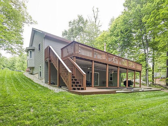 Meticulously maintained ranch style home with finished walk-out basement. This 4 bedroom, 3 bath home features a beautiful kitchen (Cambria quartz countertops) that overlooks the living room with a vaulted ceiling. The primary suite offers two closets and its own full bath with jetted tub. Step out onto the elevated deck perfect for grilling and chilling. Main level laundry offers convenience and ease. The finished basement leads to a covered lower deck perfect for watching the wildlife. The family room/rec room has plenty of natural light and provides an open canvas for your needs. The lower level also has the 4th bedroom and full bath. Enjoy nearly an acre of land with the extra lot next door included in the sale. Apple Valley Lake has a full-service marina, three beaches, two clubhouses, plus an indoor and outdoor pool.