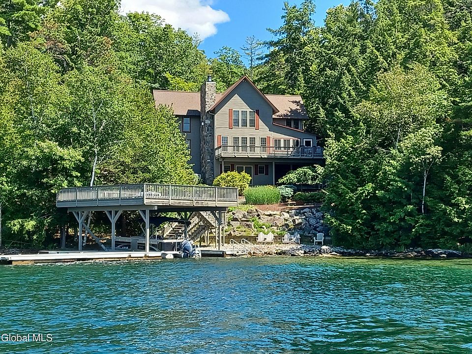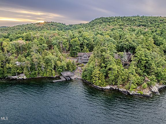 A masterfully planned and constructed custom home nestled into a lakeside knoll on 270 feet of waterfront on northern Lake George shoreline including an additional 431 wooded acres which can be enhanced by adding an second residence or guest house. The open floor planned house, with custom stone fireplace accommodates a cozy small group, or expands to hold larger groups of friends/family. There is a den & Full bath on the main level with a large screened porch overlooking the lake. Multiple decks and terraces afford spots for relaxation offering great lake views. On the second floor there are three large bedrooms and 3 full baths, 2 are en-suite. On the lowest level with walkout French doors to the lakeside docks there are several very large multipurpose rooms with an existing bath, which may be repurposed into sleeping or recreation areas. On