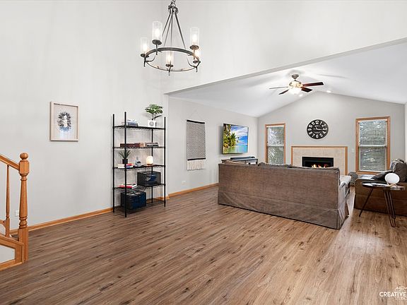 Absolutely move in ready! Shows like a model! Private covered entry! Spacious foyer with tile flooring! Upgraded eat-in kitchen with extended oak cabinetry with crown molding, stainless steel appliances, Corian countertops, pantry closet, extra recessed lighting and separate eating area with sliding glass door to the very private custom deck backing to tree line and open field! Separate formal dining room with upgraded chandelier! Cozy family room with cathedral ceilings, gas log fireplace with tile surround and accent lighting! Convenient 1st floor laundry! Split staircase with upgraded oak railings! 2nd floor loft could easily be 3rd bedroom or office! Large master bedroom with cathedral ceilings, huge walk-in closet and luxury bath with oversized dual sink vanity, whirlpool tub and tile flooring! Gracious size secondary bedroom! Large English basement awaits your finishing touches! Awesome location with quick access to I-90, train and shopping! Neutral and no work needed here!