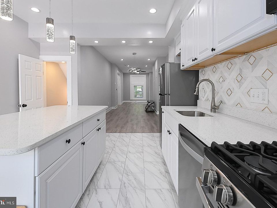 Beautifully renovated Federal-style Baltimore rowhome offering a true move-in ready experience in the McElderry Park neighborhood, just minutes from Johns Hopkins Bayview. Step inside to an open concept main level featuring a large kitchen island with knee bar seating, granite countertops, stainless steel appliances, above-range microwave, motion-activated faucet, and stylish tile floors. Luxury vinyl plank flooring flows throughout, complemented by modern finishes, ceiling fans in the bedrooms, and abundant natural light. The second level includes two bedrooms, a full bath with walk-in tiled shower, and a flexible middle room with closet that works perfectly as an office or bonus space. The fully finished basement adds even more living options with a bedroom, full bath, common area, and washer/dryer. Outside, enjoy a private rear patio, while the new roof and brand-new AC system provide peace of mind. Surrounded by neighborhood revitalization and convenient to parks, schools, and commuter routes, this home is an excellent choice for buyers and agents seeking style, function, and value within the city.Don’t miss your chance to own a fully renovated city home with modern finishes and timeless character—schedule your showing today and experience everything this property has to offer!