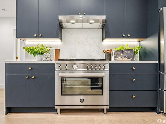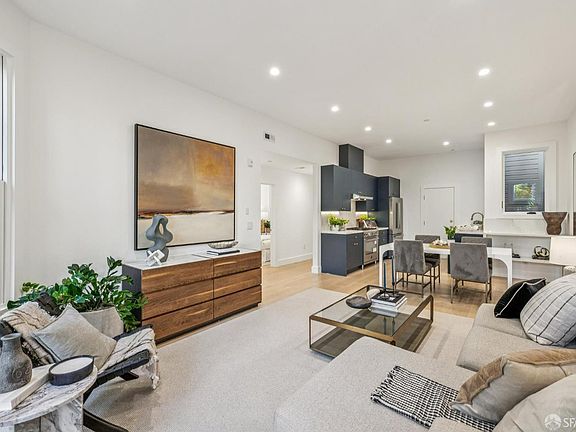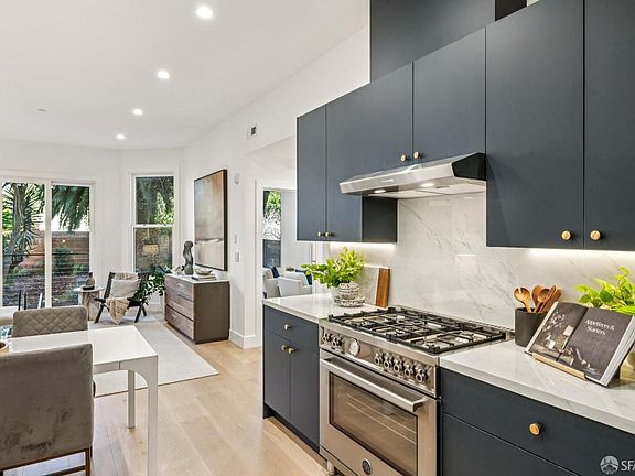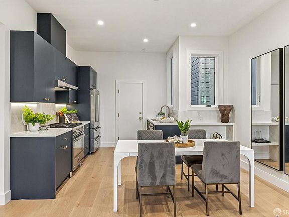 Full-Floor 4BR/2BA Hayes Valley Residence Overlooking Serene Garden. Down-to-the-studs, newly remodeled and spacious full-floor home in the heart of Hayes Valley. Private entry, high ceilings, wide-plank white-oak floors, recessed lighting, and mostly double-paned windows. Modern open-plan living/dining area with bay windows overlooks a shared rear garden with mature landscaping. The kitchen features custom cabinetry with under-cabinet lighting, Porcelanosa counters with backsplash, and stainless appliances including Bertazzoni 5-burner range with hood, Samsung dishwasher, and Bertazzoni French-door refrigerator with ice maker. Expansive primary suite has bay windows facing quiet Page Street, a designated Slow Street & bike path. Primary bath includes floating vanity with double sinks, glass-enclosed walk-in shower, and tankless toilet. Three additional bedrooms offer generous closets; one with bay windows staged as an executive office. Guest bath with shower over tub. Washer/dryer hookups and tankless water heater. Located steps from Valencia Corridor, Lower Haight & Hayes Street shopping/dining with easy public-transport access.