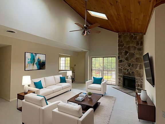 Vaulted ceilings fill the living room with natural light