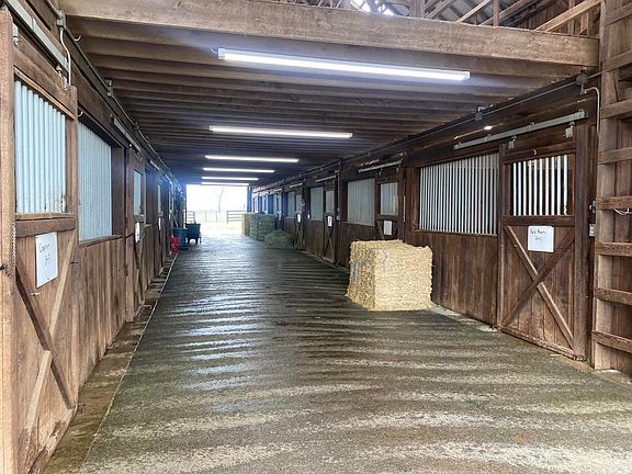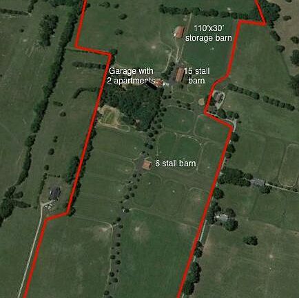 Turn key 80 acre horse farm property with excellent location! This beautiful property is the perfect size for many equine pursuits and is very well designed for functionality and ease of use. Amenities include 21 stalls in 2 barns, 15 paddocks and 4 fields with plank fencing, round pen, and an oversized 50x50 garage with TWO apartments. The current owner has also constructed a very useful 110x30 metal storage/hay barn with 12ft doors and concrete floor.