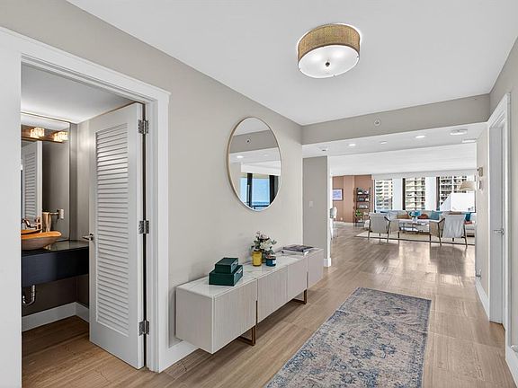 The wide J-stack layout provides true east–west exposure: direct ocean views from the main living areas and primary suite, and sweeping Intracoastal and sunset views from the dining area and secondary bedrooms. Interior features include Italian marble flooring in all main areas and baths, built-in Viking kitchen appliances, floor-to-ceiling impact glass, and a private floor plan with only three units per floor.