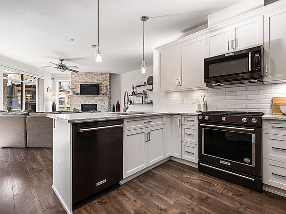 The Boardwalk – 1 bdrm PLUS den, 2 baths & a large patio in a prime location! This rarely available 1080 sqft ground-level condo blends MODERN LUXURY with UNBEATABLE LOCATION—steps to the Rotary Trail, Vedder River & Garrison Crossing. Enjoy HIGH-END FINISHES: KitchenAid black stainless appliances, gas range, quartz counters, subway tile, soft-close cabinets & under-cabinet lighting. The spacious bedroom features a walk-in closet & SPA INSPIRED ENSUITE with soaker tub, glass shower & double sinks. Versatile den, A/C in both living room & bedroom, plus a ground level COVERED PATIO with stunning mountain views. Pet-friendly, no age restrictions, secure parking, storage locker & low strata fees. RARELY AVAILABLE LAYOUT - ACT FAST!