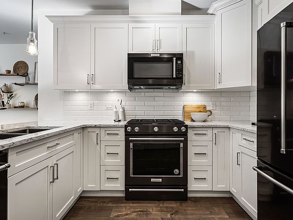 Large patioGround-level condoModern luxuryHigh-end finishesKitchenaid black stainless appliancesGas rangeQuartz counters
