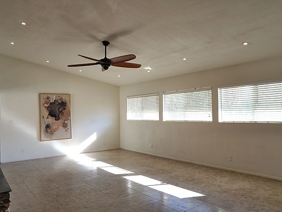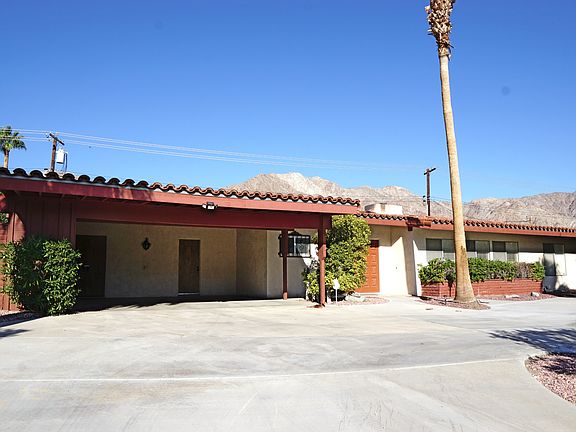 Three-bedroom, two-bathroom pool home on a double lot in La Quinta Cove. This mid-century Spanish-style home features a formal double-door entrance, cathedral ceilings with fans, an updated kitchen with stainless steel appliances and granite countertops, and a retro bonus room with a bar area. The property includes a large covered carport, RV parking with hookups off the circular driveway, and a backyard with a covered patio and a spacious swimming pool. Pool and landscaping maintenance are included in the $2700 monthly rent for an annual lease.