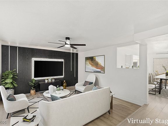 Beautifully remodeled townhome with designer touches thruout! The living room features an acoustic slat accent wall with color changing capability lighting & TV mount. In addition, there is a custom modern iron stair railing.The kitchen offers a unique slat paneled breakfast bar, SS appliances, upgraded sink & a sleek black faucet. New vinyl plank flooring, high flat baseboards, ceiling fans, black door hardware & fresh paint thru out. The spacious primary suite is separate from other bedrooms w/large walkin closet. Primary Bathroom has upgraded shower w/black hardware &plenty of cabinets including a medicine cabinet for storage.The two addtl bathrooms have been updated w/new vanities, upgraded sinks & stylish finishes. One includes a large upgraded tiled shower & a light-up mirror that opens for addtl storage. Enjoy your private patio & the lush landscaping in the community. Includes a 1 car garage & covered parking spot. Located near major shopping, restaurants & easy freeway access.