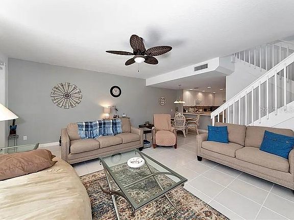 Village Walk townhome on Palmer Ranch, Sarasota, FL. Three bedrooms, 3 baths. Amenities include 2 pools - pool with tiki bar and a lap pool, state of the art clubhouse with fitness center, tennis, pickleball, ballroom, meeting rooms, gas station, cafe, walking trails and bike paths. This is a furnished rental with a King and 2 twins in the 2 upstairs bedrooms, and a Murohy bed in guest bedroom downstairs. The primary bedroom comes with a private balcony. Unit has a central vacuum system. Private screened courtyard with electric awning. 2 car garage.