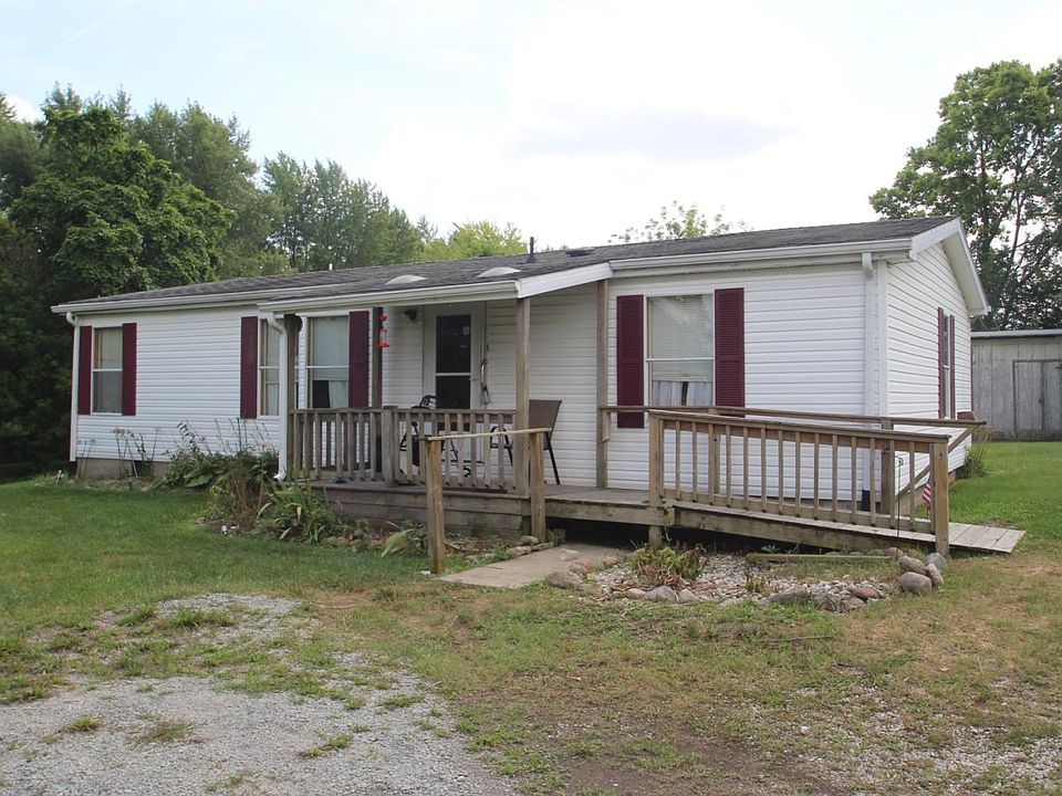 Located in a peaceful setting yet still close to town, this 3-bedroom, 2-bathroom home sits on a spacious 1-acre lot. A front wooden porch with ramp accessibility, and the side wood deck offers extra space to enjoy outdoors. The property also includes a 10x11 storage shed! Inside, you will find a mix off carpet and vinyl flooring. Both of the bathroom's feature stand up showers! Appliances including the refrigerator (2018), electric range (2021), washer, electric drier (2013), and ECO water softener are all included in the sale. Recent updates include a water softener and water heater (2023), kitchen flooring (2023), and living/dining room carpet (2020). The east bathroom was renovated in 2020 with a new shower, sink, toilet, and flooring, while the west bathroom received a new shower, sink, and flooring in 2021. The home also features a furnace and central air installed in 2011. Full of potential and waiting for its next owners to make it their own.