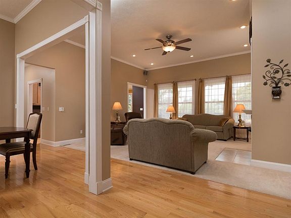 Immaculate home tucked away on a desirable street with lots of living space inside and outside! As you enter the home you will be greeted by an open living room and dining room both boasting 11' ceilings and crown molding. The light filled living room includes an attractive gas log fireplace with surround sound and wiring closet to support your big screen TV above the fireplace. Enjoy cooking in your spacious kitchen with hardwood flooring, crown molding, an abundance of cabinetry, work island with breakfast bar featuring granite counters, speaker system plus plenty of lighting both natural and otherwise. Off the kitchen find an inviting nook with access to the private deck overlooking the backyard. Four bedrooms on the main level, two on either side of the main living area, all have 9' ceilings. The large owner's suite with private access to the rear deck offers private bath jet tub, shower, walk-in closet and speaker system. There is also a second full bath to accommodate the two additional bedrooms flanking the opposite side of the main living area. The nicely finished lower level with 9' plus ceilings includes a expansive gathering room with french doors to a private patio, office space, 5th bedroom and an additional room which offers lots of potential for many different uses including a den, workout room or 6th bedroom if necessary. Roomy two car garage with 10'+ ceiling plus a lower level garage for all of your lawn equipment, tools and storage need. Professionally landscaped grounds with accent lighting makes this home shine day and night. So much to offer with everything needed on the main level. Conveniently located to Rt. 60 and I-64!