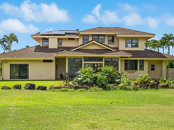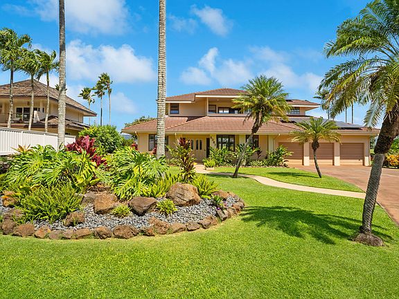 Experience refined island living in Po'ipu’s coveted Kiahuna Golf Village. This beautifully updated 3-bedroom, 3-bath single-family home spans 2,763 sq ft on a 15,610 sq ft lot fronting the golf course with dramatic mountain views and sunrise-to-sunset vistas. Designed for effortless tropical living, the open-concept layout connects indoor and outdoor spaces, welcoming trade winds and golden Kaua'i light throughout. A remodeled kitchen anchors the home, perfect for entertaining family and friends. The entire upper level is a private primary suite with a spacious bedroom, separate study, and outdoor lanai surrounded by lush greenery—an idyllic retreat for morning coffee or sunset relaxation. Split A/C provides year-round comfort, while new tropical landscaping enhances privacy and serenity. A large enclosed garage accommodates two cars plus a golf cart, ideal for island living. Located on a quiet cul-de-sac just minutes from Po'ipu Beach, golf, fine dining, and boutique shopping, this elegant home captures the essence of Kauai’s relaxed luxury lifestyle.