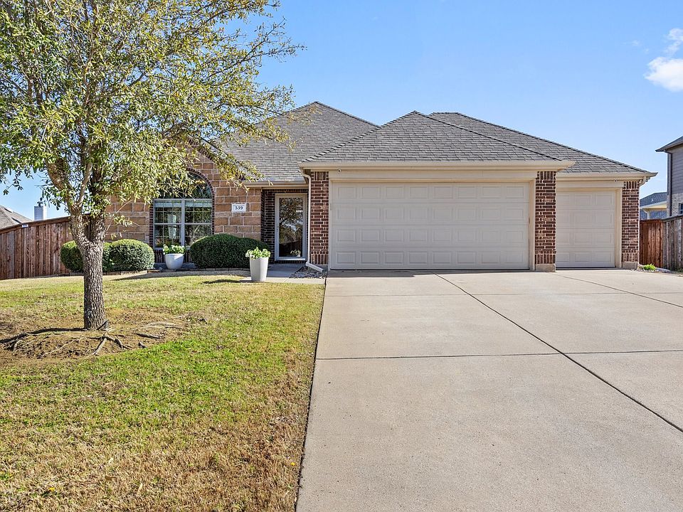 This gorgeous home boasts incredible curb appeal, a three-car garage perfect for a large vehicle and shop, and a prime location just minutes from the lake! Step inside to soaring ceilings and an inviting formal living and dining space, perfect for hosting. The spacious kitchen has been updated and features a center island with new granite, new tile backsplash and faucet, ample storage, and a seamless flow into the light-filled living area, where a cozy wood burning fireplace sets the perfect ambiance. The private primary suite is a true retreat, complete with an extra seating area or office space, tucked behind elegant French doors. Out back, you'll find a beautifully landscaped yard with board-on-board fencing and an expansive covered patio, ideal for enjoying those warm Texas evenings. Convenience, charm, and comfort—this home has it all! Don't miss out—schedule your tour today!