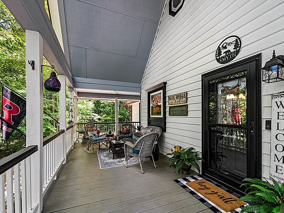 Perched in the treetops in the highly sought-after Mountain Tops community, this charming forested cottage with expansive porches and mountain views is the perfect rustic retreat! Just minutes from Historic Downtown Blue Ridge and Lake Blue Ridge, this meticulously maintained home offers convenience and warmth with updated finishes. Inside, enjoy cathedral ceilings, a floor-to-ceiling rock fireplace, hardwood floors, open floor plan, oak kitchen cabinetry, oversized primary bedroom w/ ensuite, two additional bedrooms + one bath, and a large loft perfect for office or additional sleeping space. On the exterior, you will find no shortage of entertaining space with the sprawling wraparound porch overlooking the lush Mountain View, a large fenced-in backyard perfect for your four-legged friends, plus a spacious two car garage. This home has all-paved access and is just a short drive to all "in-town" Blue Ridge living has to offer! **Furnishings negotiable.** Call today to tour this one-of-a-kind home!