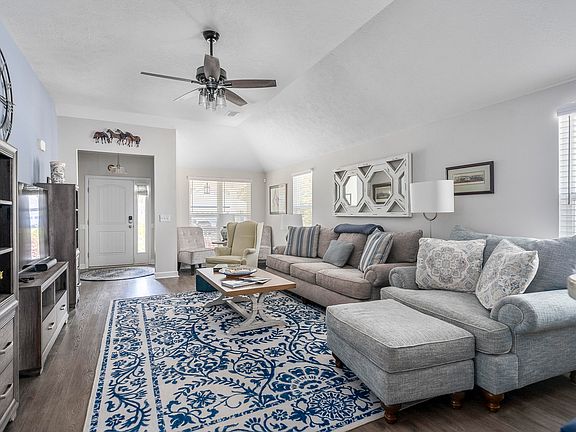 Fenced yardWelcoming rocking-chair front porchStylish white cabinetsStylish fanLarge islandChef-friendly kitchenNewer stainless-steel appliances