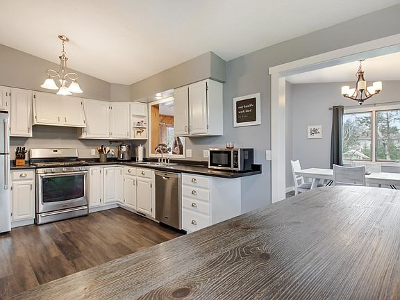 Motivated Seller! Updates galore on this charming thoughtfully updated home. Open concept living with high valuated great room ceiling, eat-in kitchen connected to a large informal dining and sunroom. Walk out to your massive deck looking out to a huge backyard. Lower-level family room with a reading nook will be great for movie nights and entertaining. Lower level also to include expansive laundry room and storage room adjacent to garage. Enjoy living next to great schools (within walking distance), county trail system for walking and biking, parks with recreation (to include frisbee golf), and downtown St. Croix Falls. You will appreciate the large list of updates: all new paint internally and externally, all new flooring throughout, new AC & hot water heater, new roof, updated appliances and more!