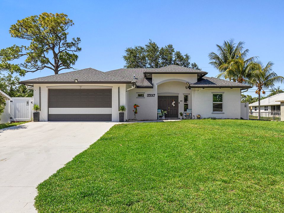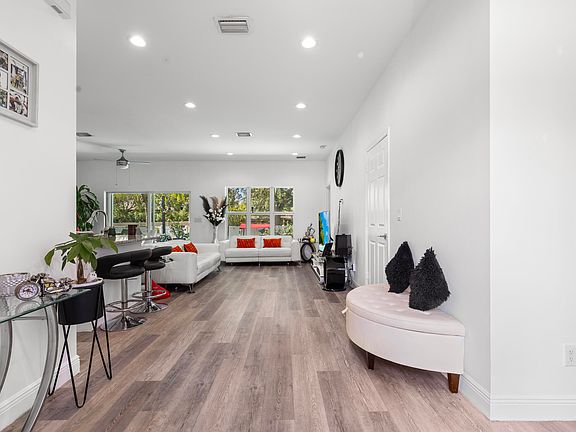 Discover this 2018 modern home in the non-HOA community of Country Club Estates, featuring 3 bedrooms, 3 full baths, and a dedicated office/den space. The open floor plan is perfect for entertaining and everyday living. 2 car garage with a smart garage door and an expansive driveway. Conveniently located near restaurants, shopping, and the beach.Step outside to a beautifully landscaped backyard with new artificial grass and a new PVC fence. This energy-efficient smart home boasts a new 2024 AC, underground gutters, hurricane impact windows and doors, LED lights, and security cameras. The property also includes Rainbird automatic sprinklers and a variety of tropical fruit trees.