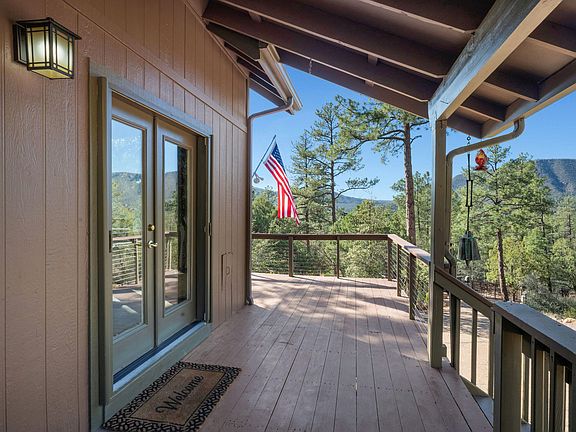 A powered custom gate welcomes you on to the fully fenced .95-acre lot of tall Pine & Juniper trees, along with a new well and abundant water supply. The great room at the heart of this turnkey home features dramatic floor to ceiling chalet windows and a soaring river rock fireplace. Expansive wraparound decks on every level showcase a stunning 360-degree view that provides seamless indoor-outdoor mountain living. Located at the base of the breathtaking Mogollon Rim, this captivating 4 bedroom and 3 bath home offers mountain views from every room and borders the National Forest providing endless opportunities to view elk, deer and explore nearby trails just out your back gate. Outdoor living shines here, whether you are soaking in the pergola covered hot tub, roasting marshmallows over the open fire pit, or taking in the evening stars from the over seven outdoor seating areas. Please come and experience this truly unique property for yourself!