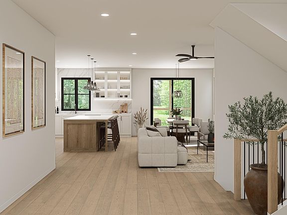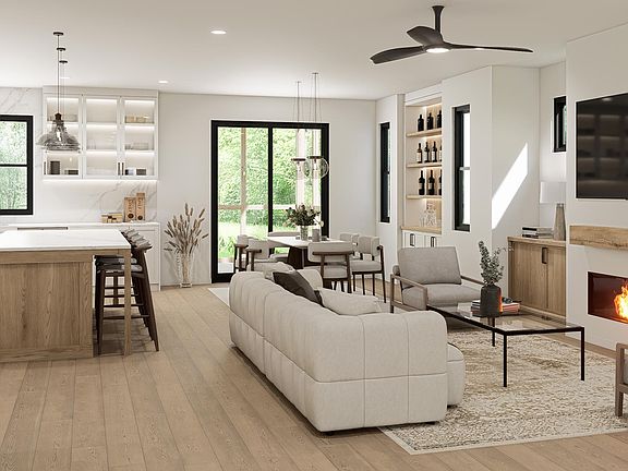 DESIGN HIGHLIGHTS: Two-story lakefront design with floor-to-ceiling white cabinetry, dramatic quartz countertops, wood beam ceilings, custom fireplace, and black-framed Andersen windows maximizing water views. Open concept living with wide-plank white oak floors throughout. Four bedrooms plus loft upstairs, main level office/flex room, covered front porch, and outdoor entertaining spaces.