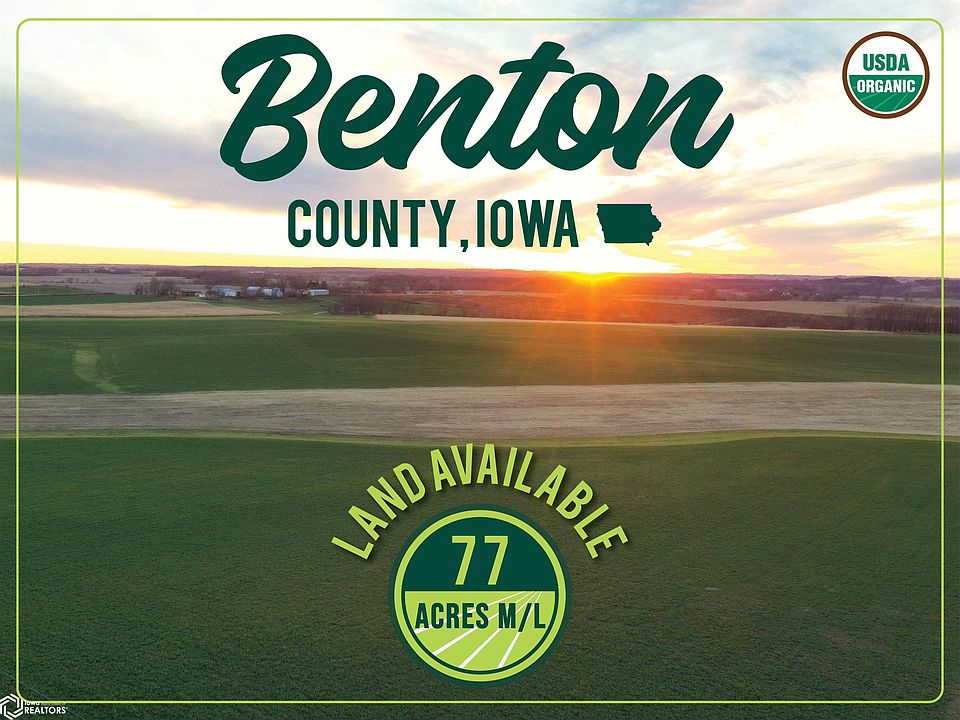 Benton County, Iowa Farmland Available! Presenting 77 acres m/l of productive farmland just north of Vinton, Iowa. This prime farm consists of approximately 69.76 FSA cropland acres with an average CSR2 of 77.7 and is designated NHEL (Non-Highly Erodible Land). There is an additional 0.5 acres m/l surrounding the acreage site to the east that could be brought into production. Nearly 100% of the parcel is pattern tiled. The land is currently USDA Certified Organic with a wide variety of crop history creating a unique opportunity for area organic farmers or those looking to diversify their plantings. The 2024 crop varieties included corn, soybeans, winter wheat, and alfalfa. There is a current planting of alfalfa that creates a nice cover and offers the potential for added spring income prior to row-crop planting. This farm is located less than 30 miles from the Cedar Rapids grain market, just off of Interstate 380, two miles from Highway 150 at the intersection of 53rd Street and 27th Avenue Drive in Section 13 of Harrison Township, Benton County, Iowa.