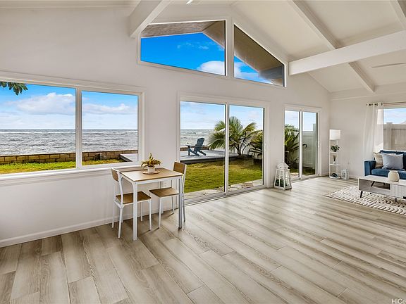 Enjoy island country living at its finest in this beautifully renovated oceanfront home located in the serene coastal community of Hau‘ula. This 2-bedroom, 2- bathroom home, with a separate office, offers a relaxed island style feel. Step inside to find a bright and breezy open floor plan - ideal for entertaining or quiet seaside living. Large windows and sliding doors fill the home with natural light and cooling trade winds, framing unobstructed ocean views and breathtaking sunrises over the Pacific. The new renovations showcase fresh interiors with thoughtful details throughout, including a brand new kitchen, new luxury vinyl plank flooring, and a completely updated electrical system. The living and dining areas flow seamlessly onto a private oceanfront yard and deck - perfect for morning coffee or evening relaxation as the waves roll in. Experience the charm of this Hau'ula gem as it offers