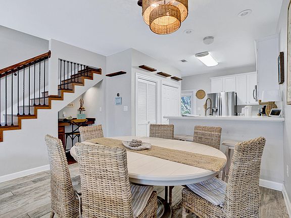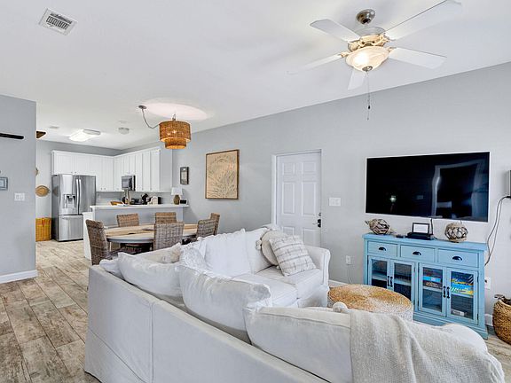 Just 2.5 blocks from the beach, this Miramar Palms townhome offers the perfect blend of vacation living and the comfort of home. With hard-surface flooring throughout, this fully furnished property is move-in or rental-ready. The first-floor primary suite features a beautifully tiled walk-in shower, and a convenient powder room sits just off the kitchen. Upstairs, hardwood floors lead to two spacious guest bedrooms, one with French doors opening to a private balcony overlooking the community.