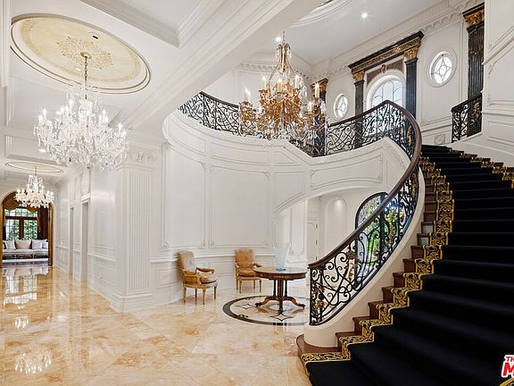 Nestled within the exclusive, guard-gated enclave of North Beverly Park, this masterfully crafted French Chateau evokes timeless elegance and refined sophistication. Set on approximately two manicured acres, the estate is enveloped by mature trees, tailored hedges, vibrant rose gardens, and expansive lawns, creating a serene and private outdoor sanctuary. A grand motor court welcomes guests, framing the stately facade adorned with classical architectural details. Inside awaits the double-height entryway with intricate wrought iron detailing, gleaming marble floors, and a sweeping spiral staircase offering an ideal backdrop for elegant gatherings and grand entrances. An array of exquisite features sets the tone for effortless luxury throughout: glittering chandeliers, French doors that flood the space with natural light, and Corinthian columns accented with gold leaf. The formal living room, with an ornate stone fireplace and rich wood flooring, offers an inviting ambiance for both intimate and grand-scale entertaining. Adjacent, the parlor/library provides a quiet retreat for study or relaxation. The chef's kitchen is a culinary masterpiece, boasting dual oversized islands, professional-grade Viking appliances, a custom refrigerator, and a double chef's range. A sunlit breakfast room opens to the enchanting rear gardens, while the formal dining room, sets the stage for memorable occasions. The family room, complete with a fireplace and entertainment center, is ideal for everyday comfort, while the private screening room and snack bar offers an unparalleled cinematic experience. Upstairs, the palatial primary suite features soaring 20-foot ceilings, a private balcony, and dual spa-inspired bathrooms equipped with rain showers, jetted tubs, and custom vanities. The exterior of the estate is a perfect retreat offering both comfort and grandeur. The pool and spa evoke the charm of a European retreat, complemented by a stately ballroom for hosting unforgettable events. A lighted regulation-size sport court accommodates tennis and basketball, while the meticulously curated rose garden provides a tranquil escape. Designed with the highest standards of privacy and security, this extraordinary residence offers not just a home but a lifestyle of unmatched comfort, prestige, and sophistication.