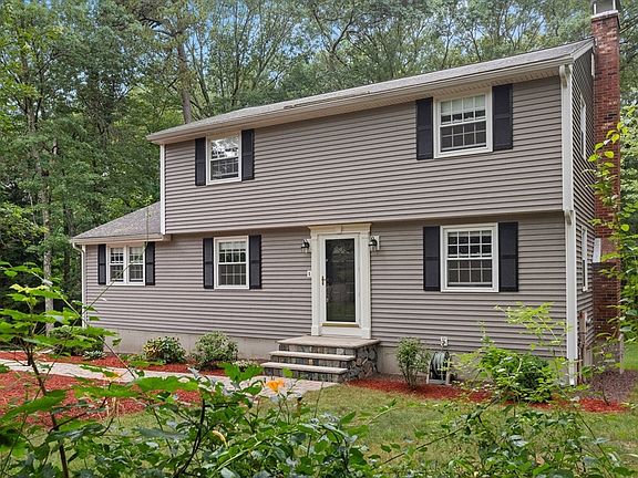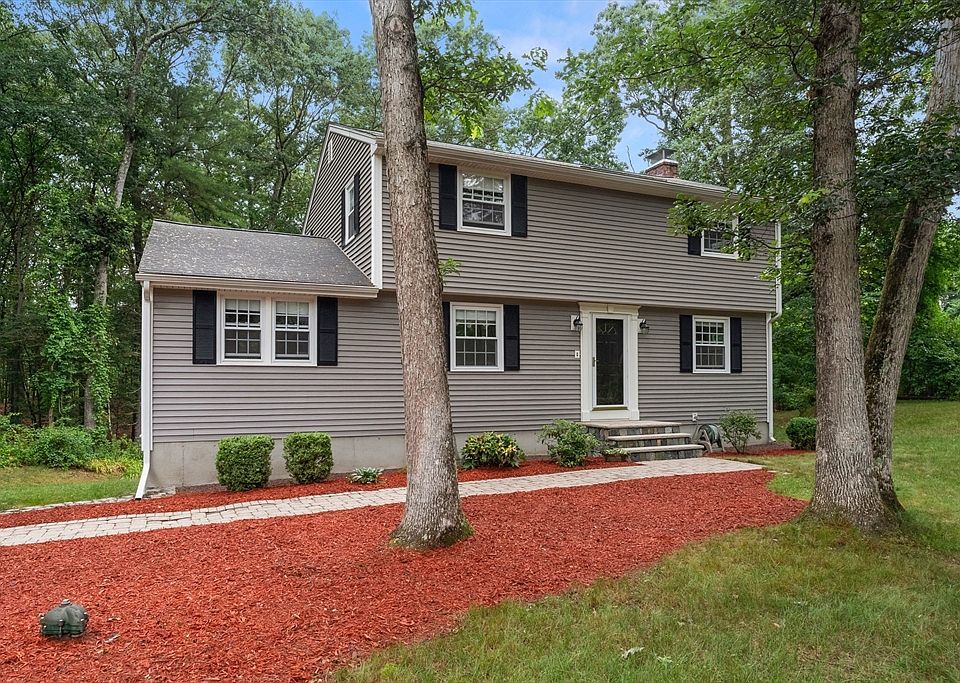 Attention Nature Lovers! Come home to this well maintained 4-bedroom Colonial on a peaceful cul-de-sac, set on over an acre of wooded privacy. The spacious front-to-back living room features gleaming hardwood floors and a stunning fireplace with glass doors. Enjoy morning light in the skylit, remodeled eat-in kitchen with granite counters, custom tile backsplash, and access to the deck. Host memorable holidays in the oversized dining room with hardwood floors and French doors to the kitchen. A pretty powder room and hall closet complete the first floor. Upstairs you'll find four comfortable bedrooms, a remodeled full bath, and a linen closet. Need extra space? Relax in the cozy first-floor den or have fun in the finished lower-level playroom. The tranquil backyard is ideal for gardening, a swing set, or simply unwinding. Easy-care vinyl siding adds convenience. A terrific value in a serene setting!