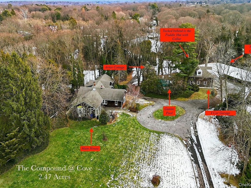 Welcome to The Compound on Cove, a diamond in the rough nestled at 54 Cove Road in the heart of Huntington, NY. Spanning an impressive 2.47 acres, this estate is making its debut on the market after 35 cherished years, offering a once-in-a-lifetime opportunity to own a piece of history and create your dream retreat.