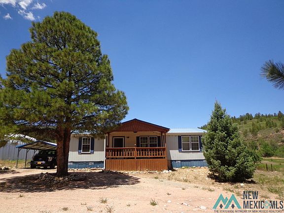 Charming double wide mobile home on a permanent foundation with community water and an acequia running at the front of the property. Sit out on the lovely covered front or back porch and enjoy the company of the humming birds, trees, and mountains. With 3 bedrooms and 2 bathrooms there is plenty of space for your needs, and the large yard has ponderosa pine and aspen trees that sway in the breeze. Photos were taken on June 10th after the fire moved through the area.