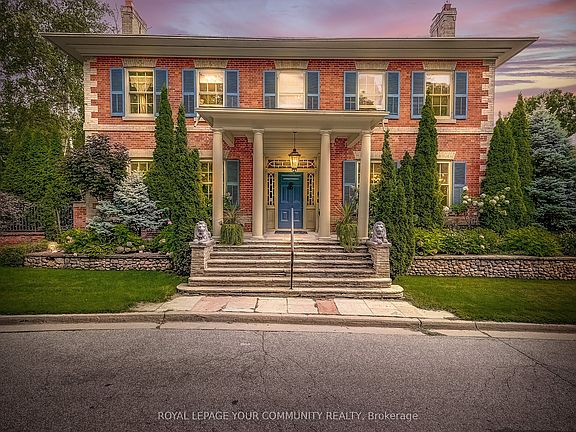 Cricklewood Mansion is a grand heritage neo-classical property with 5 spacious bedrooms and is located in the heart of Thornhill. One bedroom has been converted into a large walk-in closet and can easily be changed back into a fifth bedroom. This beautiful home is 5622 square feet plus an unfinished basement, is surrounded by walking trails and is a convenient short walk to Yonge St public transit, shops, restaurants, and future Yonge corridor subway. Stained glass windows, intricate crown mouldings and light fixtures, elaborate artwork, lush gardens, solid hardwood floors, six fireplaces, and a large Sun Room with a walk out to a private garden all make this to be the majestic property that it surely is. This is a rare opportunity to proudly own a piece of history.