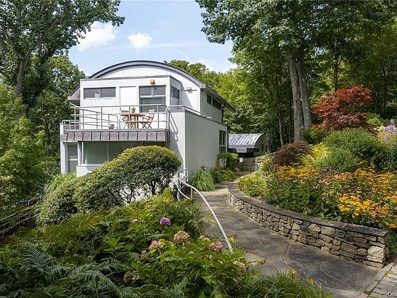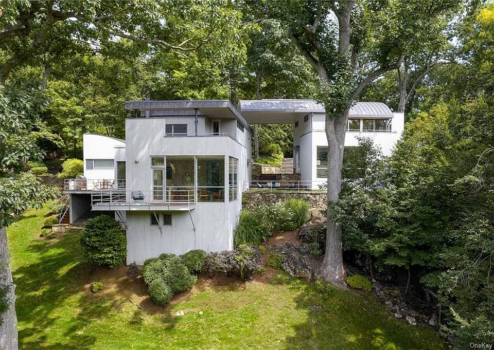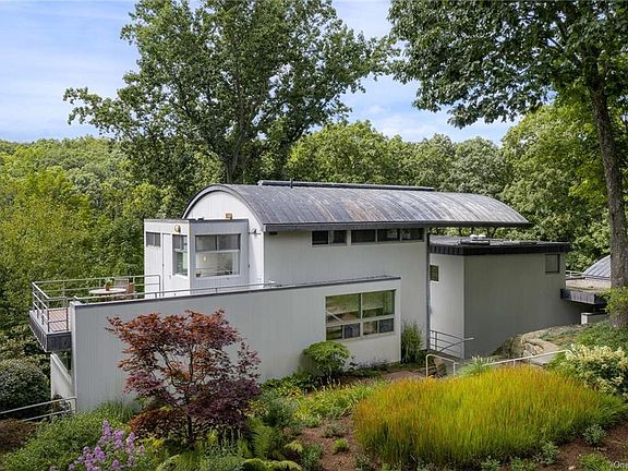 Gated private drive to stunning modern retreat in iconic Pound Ridge. Designed by renowned architects Frank Lupo and Daniel Rowen in 1995, this mini estate consists of two distinct and self-sufficient wings connected by a cantilevered, arched metal roof set on nearly 3.5 breathtaking, waterfront acres. Meticulously maintained with no detail overlooked, this sprawling 4-bedroom home is exceptional in every way. From walls of windows that usher in light, to multiple Brazilian cherry decks that overlook sweeping lawns down to the pond, a home theater and a separate air conditioned and heated six car garage complete with detail stations. Spacious and light filled with something for everyone, including a Fido-approved bathing/grooming room! Car enthusiasts, pet lovers, weekenders, and aficionados of bespoke modern design of the highest caliber, this one does not disappoint truly spectacular.