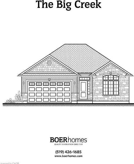 Construction is well under way! The Big Creek model offers 1402 sq.ft. of professionally designed and finished space on the main floor with a full unspoiled basement (R/I bath) allowing many options for your personalized use. Enter through the covered porch into a spacious foyer. On the main level you will find a custom kitchen with breakfast bar, convenient main floor laundry, primary bedroom with walk in closet and en-suite, a second bedroom, large living and dining rooms and patio doors to a covered back deck. This brick and stone bungalow with a double car garage comes with a fully sodded yard and Tarion Warranty. Not the design you are looking for? Call today for other models and/or lot availability. Taxes not yet assessed