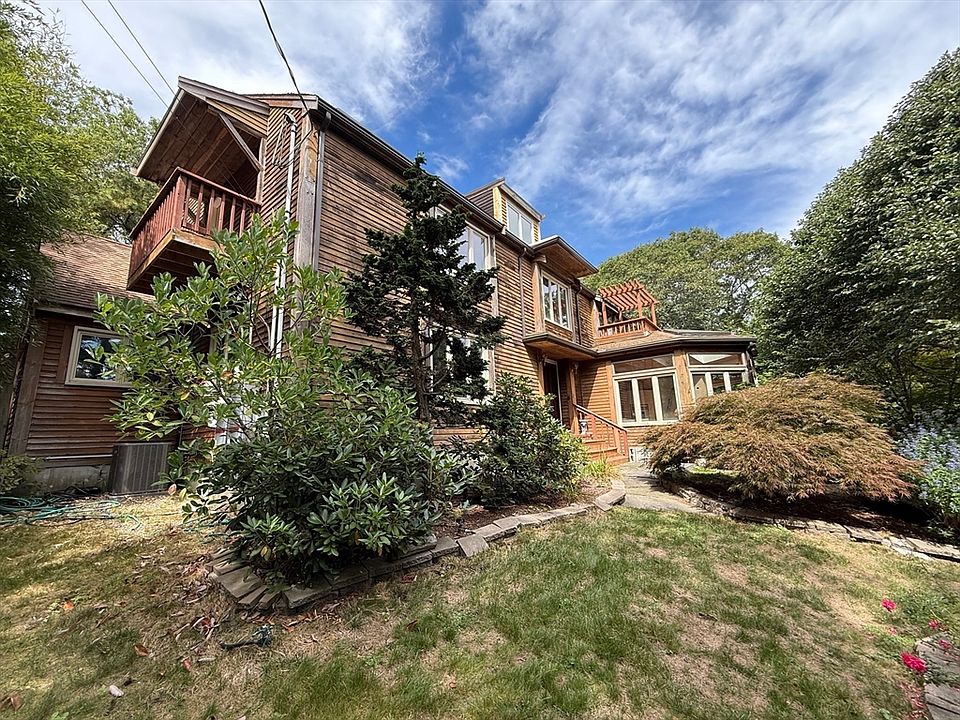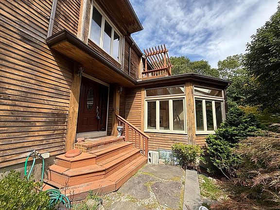 1985 Contemporary Colonial set back from street on private lot. 3 floors / Entry foyer with access to indoor pool / Fireplaced Livingroom w/hardwood floor / Custom kitchen with tile floor, granite countertops, built-in appliances / First floor laundry / Bedroom 1 with sliders to pool and custom bath with bidet and whirlpool bath / 33' Indoor pool w/beamed cathedral ceiling, shared fireplace with living room, wood stove, skylights, sliders / Custom glass and peaked Sunroom with gas fireplace, hardwood floors. 2nd Floor with Bedrm 2 with hardwood floor, closet; Main Bedroom features elevated sleeping area, sunken whirlpool tub, shower, and bathroom with bidet / Library with bookshelves, hardwood floor / spiral stairway to 3rd floor w/finished room, attic access, and custom windows. Full basement w/Media Rm, Utility room, storage, pool equipment, and two-car garage under. Exterior with decks, balconies, and hot tub. This is truly a unique home, but does need work and repairs.