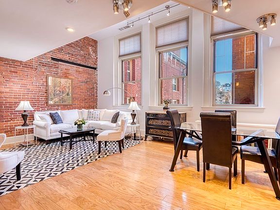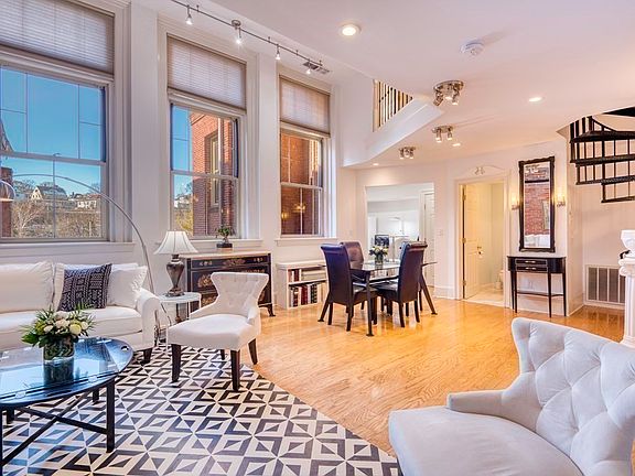 Move up to a 2 level penthouse in Medford's Historic Schoolhouse! You'll enter a spacious 1,260 sq. ft. 2 bedroom and 1.5 bathroom condo with an open concept layout anchored by an original brick wall. Huge windows under towering ceilings illuminate the living area which flows into the dining room. Beautiful hardwood-style floors throughout. The recently renovated kitchen has granite countertops & stainless steel appliances. A half bath completes the 1st floor. A spiral staircase leads you to the next floor complete w/ balcony, abundant sunshine, & skylights throughout! 2 spacious bedrooms have ample storage. Fully updated bathroom with a soaking tub. An extra room with built-in organizers could be an office or storage. 2 deeded parking spaces with additional storage in the garage. There's a tennis court, indoor pool, sauna, and a patio for barbequing. Fabulous location next to Medford Square with fine dining, public transportation and major highways. Make this condo your new home!