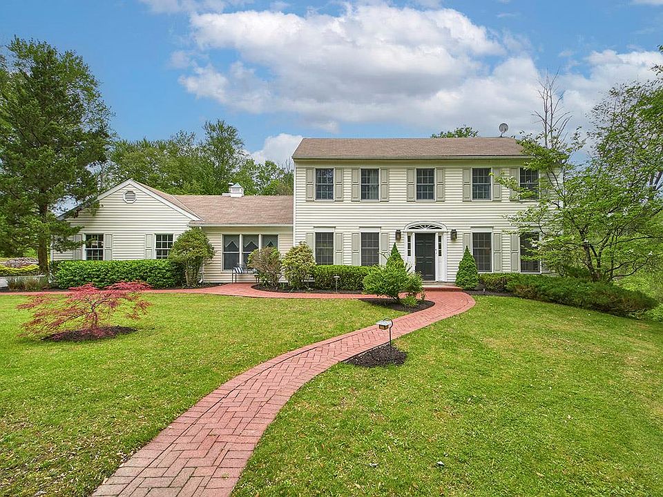 A/O. Your private oasis awaits. Set back from the road on 3.21 professionally landscaped acres, recently expanded and thoughtfully renovated 3484 square foot Colonial offers an open flow designed for luxurious living and effortless entertaining. The heart of this home is the professionally designed Chef's kitchen, featuring a spectacular center island, professional grade stainless steel appliances, including a Wolf six burner range top, double wall oven, Bosch 800 series refrigerator, Bosch 800 Series Dishwasher, separate XO 24 inch beverage refrigerator and more, inspiring culinary adventures and joyful gatherings. Relax in the expanded great room featuring oversized windows, new floor to ceiling windows and glass door out to the flagstone patio, and a cozy, but new high efficiency, wood burning fireplace. Designed with energy efficiency in mind, this area is also heated and cooled with a new Mitsubishi heat pump/AC unit. An additional large sunny living room, with custom millwork, is just beyond the kitchen boasting two sets of french doors, its own balcony, as well as doors opening to the flagstone patio for a seamless flow. A large dining room/flex office, as well as a fully renovated powder room and laundry room, complete the first floor.