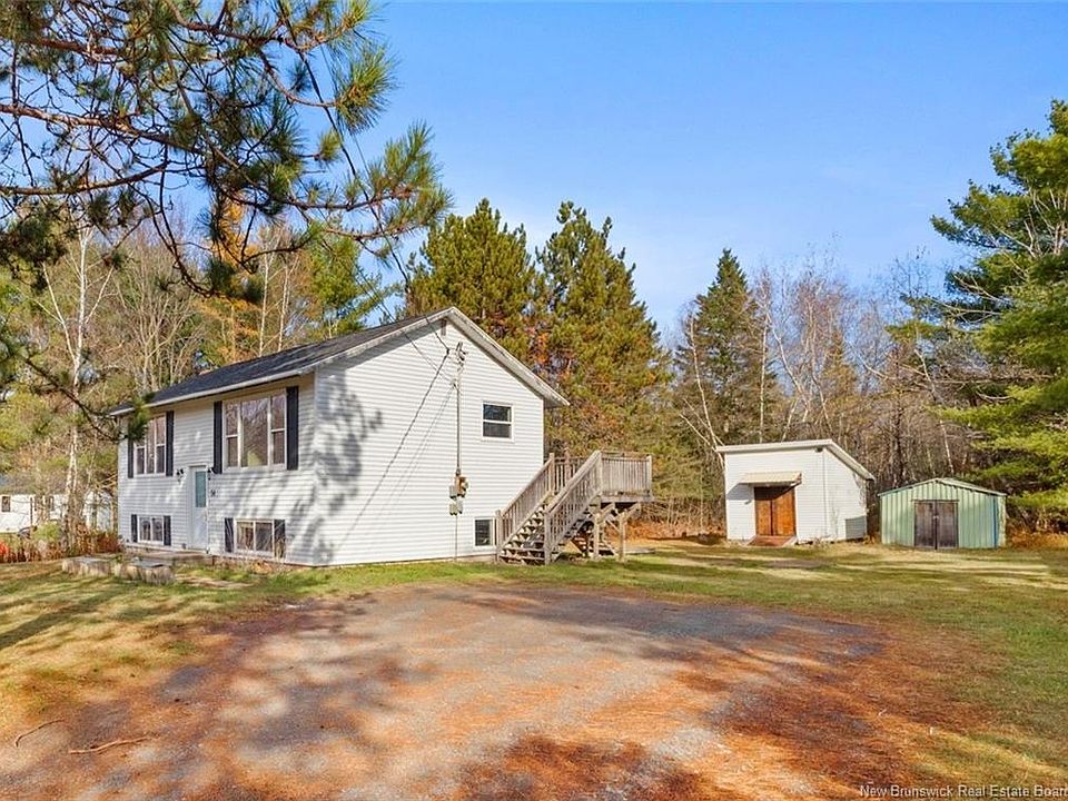 Welcome to this move-in ready 1+2 Bed, 2 full bath split-entry home in Geary, just minutes from Base Gagetown, Oromocto, and all amenities! Offering 720 sq. ft. on each level, this charming property sits on a beautiful 1.8-acre lot with a brook running through, providing the perfect blend of comfort and country living. The bright main level features a cozy living room, a modern kitchen with a center island, plenty of cabinetry, and included appliances. Patio doors lead to a large deck, perfect for relaxing or entertaining while enjoying the peaceful surroundings. A spacious bedroom and full bath complete this level. The fully finished lower level offers two additional bedrooms, a second full bath, and flexible space for family, guests, or a home office. Outside, enjoy a wired 12’ x 16’ shed, ideal for storage or a workshop, and plenty of open yard space for gardening or outdoor fun. This property offers peaceful rural living with quick access to town conveniences — and is completely move-in ready!
