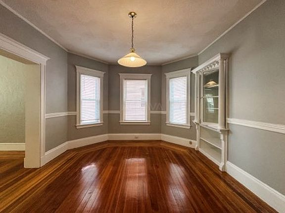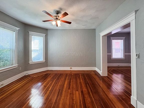 Notable amenities include a ceiling fan, a dining room, hardwood floors, high ceilings, a living room and a modern bath. Rent includes municipal water. The modern eat-in kitchen includes a dishwasher and electric range. Available on 12/01.