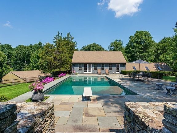 One of Weston’s finest original historic homes, this enchanting double entry colonial with magnificent sunset vistas displays impeccable stewardship. Beautifully expanded & remodeled with custom woodwork, wide-plank pine/oak floors, multiple fireplaces, French doors to delightful brick patios, the house sits on 2.86 acres planned for spectacular color by Gregory Lombardi Design with perennials/specimen trees/expansive lawn/stone paths. Hilltop pool with waterfall/hot tub/pool house & 7-car barn for collector/boat. Gorgeous front-to-back living room with wet/bar/glass doors to garden, superb chef’s kitchen & breakfast room, formal dining room, bookcase-lined library & bonus 2-bedroom 1st floor guest suite & lower level double office feature private entries. Master bedroom wing has 2 walk-in/cedar closets, marble spa bath & fantastic skylight great room; 3 additional bedrooms on 2nd floor & attic skylight playroom. Property abuts golf course, conservation trails & minutes to commute