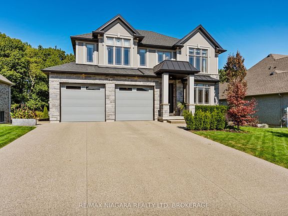 Perched atop the escarpment, this stunning custom-built two-storey home offers generous finished living space, featuring four spacious bedrooms, four bathrooms, an oversized double-car garage, a walkout basement, and the added privacy of no rear neighbours. Designed with luxury and comfort in mind, the home features high-end finishes, designer details, and beautifully landscaped grounds. From the moment you arrive, the striking curb appeal and custom front door set the tone for what awaits inside. The main floor welcomes you with soaring ceilings, intricate ceiling details, and large windows that fill the space with natural light. Just off the entry, a sitting room creates the perfect spot to gather with guests, while a stylish powder room adds convenience. The heart of the home is the chef's kitchen, complete with an oversized island, B/I fridge/freezer, ceiling-height cabinetry, and a generous pantry with built-ins & a bar fridge, all flowing seamlessly into the dining and living areas. A gas fireplace with custom built-ins anchors the living room, and the dining space opens onto an oversized composite deck with a staircase leading down to the backyard, making entertaining effortless. Upstairs, the primary suite overlooks the peaceful backyard and features a spa-like en-suite bathroom, a W/I closet, and ample space to relax. Three additional bedrooms share an oversized bathroom, and the convenience of second-floor laundry makes everyday living a breeze. The fully finished basement is designed for entertaining, featuring a sophisticated rec room with B/I cabinetry, wet bar, and a luxurious bathroom with heated floors and oversized tile. A walkout leads to the covered patio and the expansive backyard, where you can enjoy the tranquility of nature right at your doorstep. Located near top-rated schools, premier golf courses, convenient highway access, and exceptional shopping, this home seamlessly combines luxury living with everyday convenience. Luxury Certified.