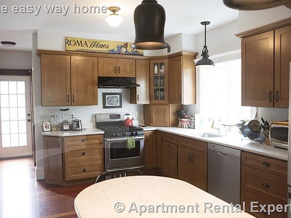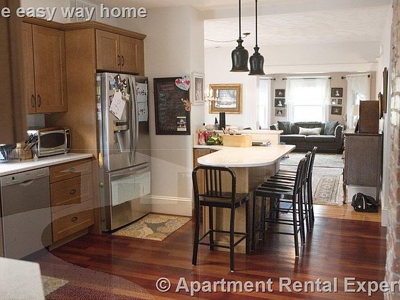 Renovated for owner occupant to extraordinarily high standards. Living room + dining room with great sight lines with open vistas broken up by unique woodwork. Extra room sized space wraps off of dining room at base of stairs to 2nd floor, and stairs are 1/2 open and look really cool. Very nice enclosed front porch off of this extra space. Side by side washer-dryer in unit. Kitchen is crazy nice with custom cabinets, all high end appliances, composite countertop with peninsula with room for bar stools. All bedrooms big + extra room sized open space on top floor for study or whatever you need it for. Central AC. Walk in closet in one bedroom and all bedrooms have good closets. Back porch. Driveway is exclusive use for this unit and is big enough for at least 3 cars tandem - fits 4 normal sized cars - and street parking is very easy. Very reasonably priced for this level of quality only 20 minutes walk to Davis and around the corner from Tufts University. Possibly some flexibility with the move in date. (Reference #172463)