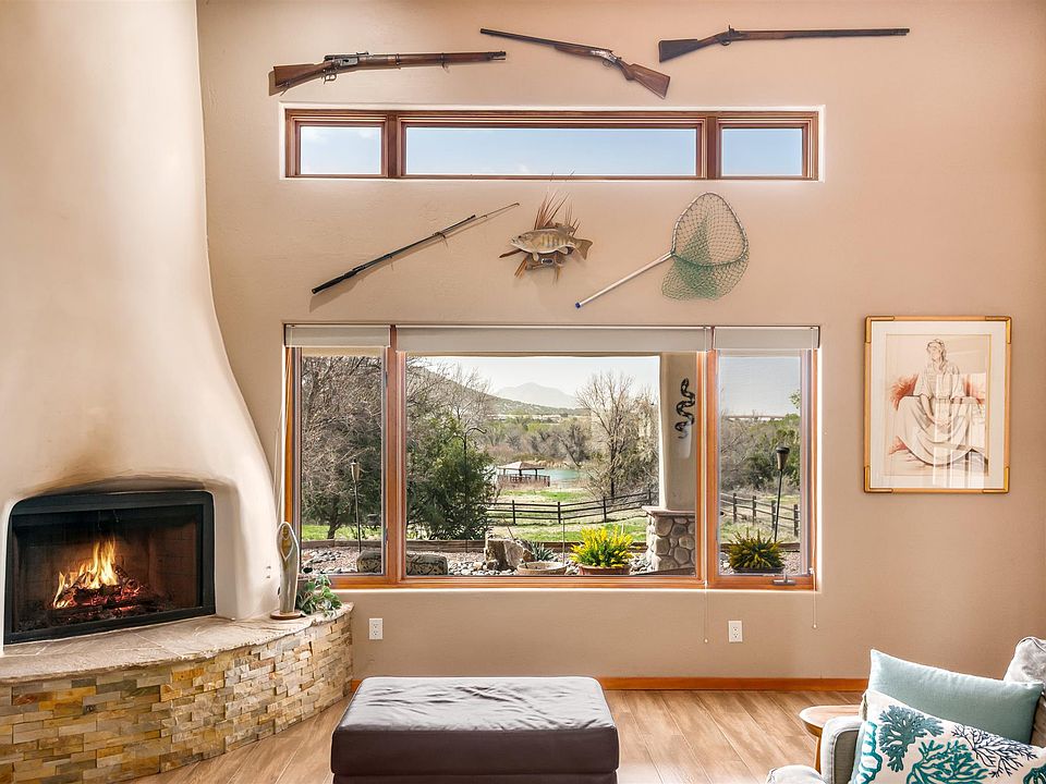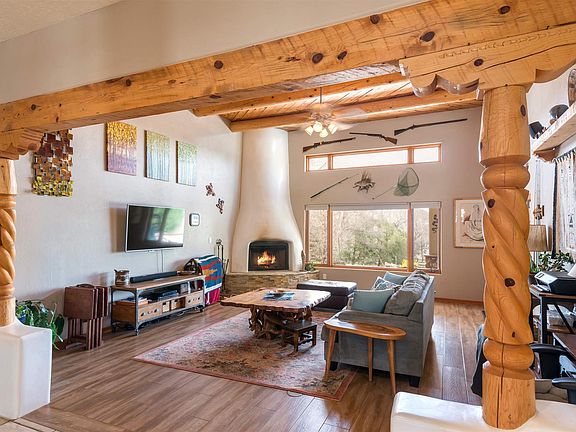 This beautiful home in Las Lagunitas is one-of-a-kind, offering gracious country living just minutes from the center of Santa Fe. The serene setting overlooking the community lake is the perfect place to enjoy the outdoors with great birdwatching, catch and release fishing, and access to walking trails. The 1.26 acre lot features large trees, extensive landscaping and natural surroundings. Gorgeous home with a warm and inviting, open living room (with a charming kiva) and kitchen is perfect for entertaining. It features a very large master suite and spa-like bath with nice separation from the other bedrooms. Over-sized garage provides plenty of storage. Great location with easy access, yet a rural feel.