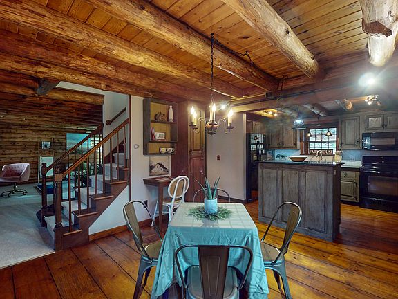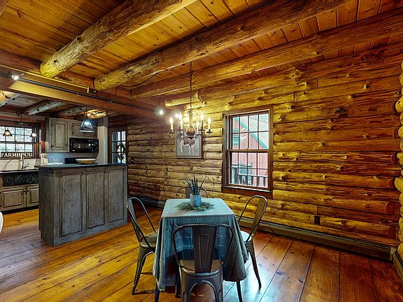 This charming center chimney Log Cape will warm your heart with rustic appeal and the smell of pine! Surrounded by a natural landscape, this one owner home proudly offers wide board pine floors, pine ceilings with exposed beams and an open floor plan with a welcoming front rocking porch! Custom cabinetry enhances the country kitchen and offers a center island plus dining area seating, granite counters and a farm sink. The Great Room features an inlaid brick hearth with VT Castings Defiant Encore woodstove and new Berber carpeting. Upstairs you'll find three spacious bedrooms with character - vaulted pine ceilings, ample closets, new carpeting and a second full bath. The lower level features a heated recreation room, utility and storage space, plus a convenient home office space. The post and beam garage offers a full walk-up loft for hobbyists or additional storage. This well- maintained home is conveniently located close to stores, schools and highway access, yet tucked away with forest views on a quiet road only minutes walking trails.