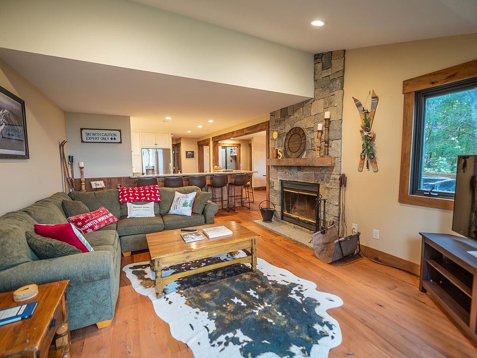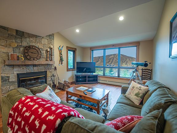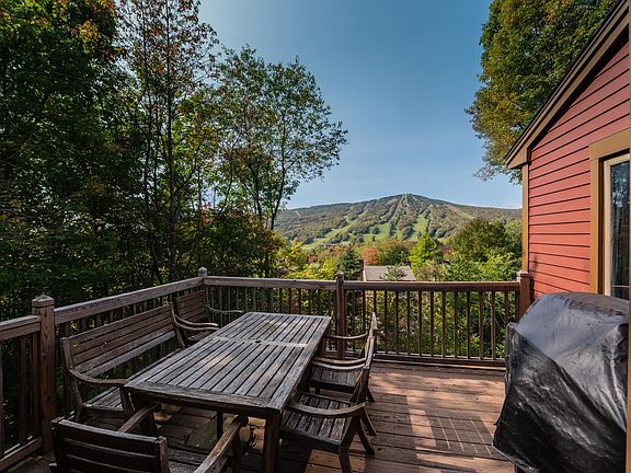 Recently cleared for a breathtaking view from this Timber Creek townhome. Located directly across from the main entrance to the Mount Snow ski resort, this stunning updated end unit offers all the benefits of a home away from home with almost none of the upkeep. Enjoy amazing views of the ski trails, fireworks displays, groomers, sunsets, and torchlight parade out the windows of your own unit, with direct shuttle service from your front door to the base area, and convenient amenities including an on site management company, exterior maintenance, snow removal, landscaping, and more. Inside you are treated to an open concept living space with a large updated kitchen with granite counters and stainless appliances, wraparound breakfast bar, a wood burning fireplace with stone hearth, gorgeous updated picture windows open to the view, large deck for entertaining, large guest bedroom and full bath with radiant floor, rustic mudroom entry with bench and cubbies, ski locker, and covered front porch. Upstairs is a primary suite, soaking tub and shower. The bright walkout lower level has 2 large bedrooms still with great views, a full guest bath, lower deck ideal for a hot tub spot, large sauna, laundry room, owners closet, and updated floors and barnboard paneling throughout. This is complemented by the Sugar House amenities center including indoor pool, hot tub, gym, racquetball and basketball courts, locker rooms, tennis courts, and cross country ski trail system and warming house.