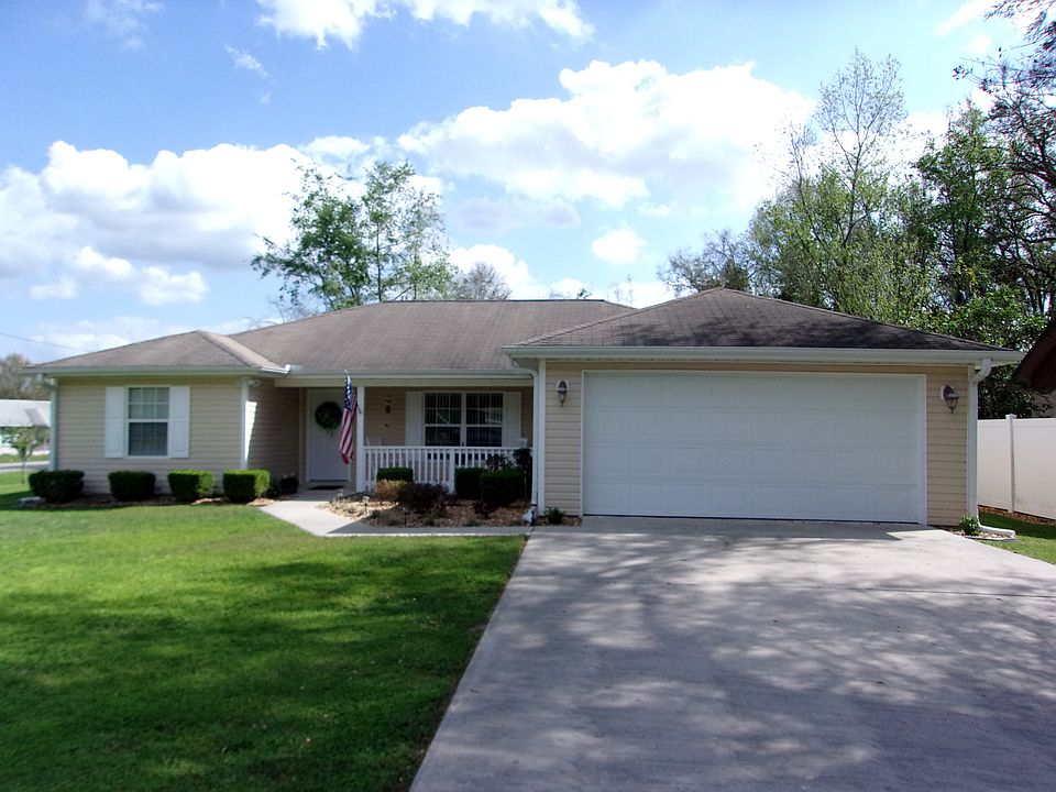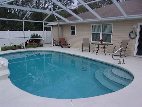 Lovely 3/2/2 Pool Home on corner lot, with fruit trees. Enjoy large screened pool area with waterfall or relax on the front porch. Split bedroom plan with cathedral ceiling, shows light and bright open flow. Eat-in kitchen includes newer stainless appliances. Inside laundry, with laundry tub,new washer/dryer. Dining room with sliding doors to pool area. Ceiling fans in bedrooms and living room. Master includes walk-in closet. Garage includes extra insulation,door opener and stairs to the attic. Tubes in the walls for pest treatment. Motion security lights in front and back. Low electric with energy star appliances. Septic cleaned 4/17. Termite 11/17 bond included. Heat/AC checked 1/18. Carpet cleaned 2/18.Builder's plans transfer Ready to move into. Quiet desirable neighborhood. Agent/Owne