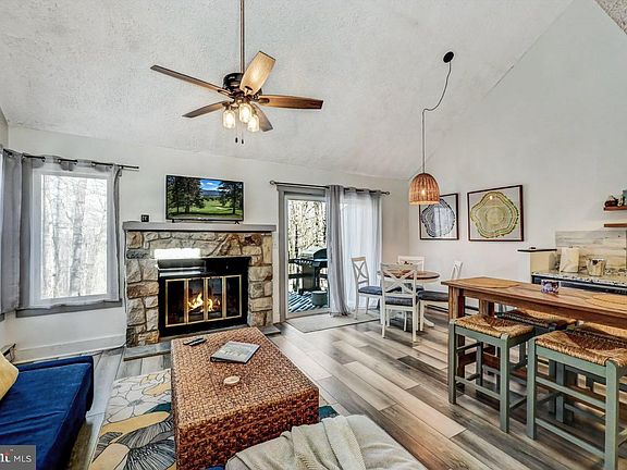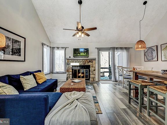 End Townhouse with modified Kitchen Floor Plane to this clean inviting ''Alpine'' Mountain home in Snow Ridge Village. Cathedral Living Room, Dining Room, Kitchen with outdoor rear private deck overlooking natures bountiful trees and natural setting. First floor with 1 Bedroom and adjoining bath. Upper level enclosed bedroom loft with 1/2 bath. Remodeled kitchen, Patio slider door, appliances and flooring. Community water & Sewer, Rentals permitted. Summer membership to Big Boulder Lake.