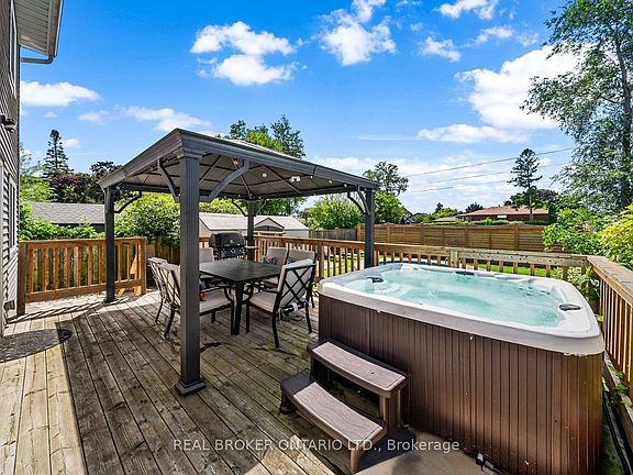 Large islandStainless steel appliancesVaulted ceilingsAmple closet spacePrivate backyard oasisBacking onto greenspaceHot tub