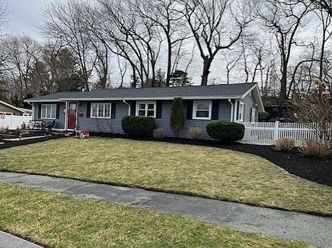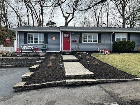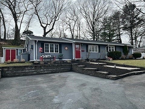 Single level living in Peabody. Extensive renovation on this beautiful Campanelli slab ranch. New roof, gutters, siding, driveway, kitchen, & floors. A new main bedroom with walk in closet and bath on one side of the ranch with the remaining three bedrooms on the other side. Maximum privacy for the owner suite. The Kitchen was completely remodel with center island, granite counters and new appliances. Professional hardscape and landscape. 2 Sheds one with electricity and insulation perfect for a workshop or additional storage. Dramatic waterfall in private back yard. Fenced in yard for addition privacy. This home is located on the 13th hole of the Salem Country Club. A must see.