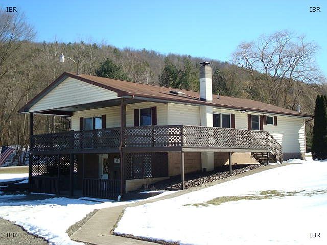 Contemporary ranch nestled in the scenic hills just south of Ithaca only 20 minutes away. 4 bedroom and 2 full baths including master suite. Open space spread over 2 floors including 18x16 living room with tongue & groove vaulted ceilings and sliding doors to partially covered wrap around deck. Great for gatherings or taking in the distant views. Nice kitchen also with vaulted ceilings, oak cabinets and a dining area overlooking woods. Spacious family room with pellet stove & doors to patio. 36x28 garage with power, storage above,fully insulated and finished with sheetrock ceiling.Garage is heated with a coal stove. Large lot with year round stream Great condition.